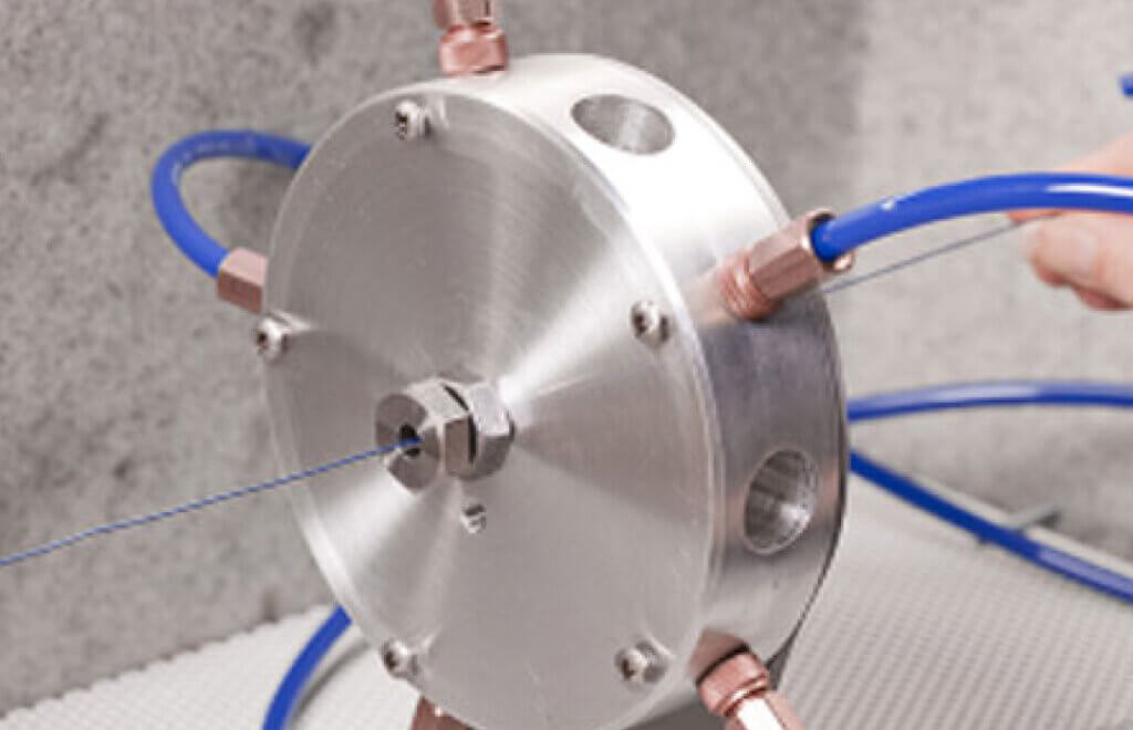Uniformly texture or remove coatings from a wire, rod or cylindrical part. Designed for both reel-to-reel and wire-end applications, the Ring Nozzle creates a sharp delineation without the need for masking