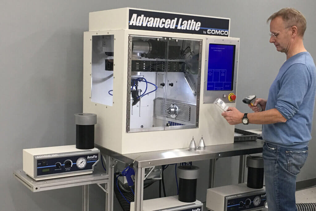 Advanced Lathe has been engineered to operate with either the AccuFlo or PowerFlo families of Comco blasters. The AccuFlo model is most commonly used for single nozzle applications. Multiple AccuFlo units or the PowerFlo are recommended for applications requiring multiple nozzles.