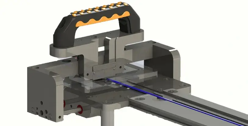 This cutter uses a hand-held blade that fits into a .010″ wide slot for clean, straight cuts. The blade drops between ball bearings to cut the smallest sizes and will cut parts down to .010″. It works great for braided catheter cuts, too.